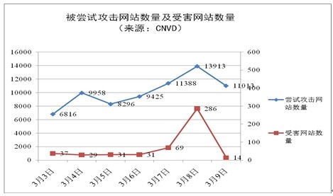根据CNVD成员单位——上海交通大学网络信息中心在华东地区教育网内的监测结果,共有1903个攻击源IP对9972个网站IP发起尝试攻击。如下图所示,从2月26日至3月8日,被攻击网站IP数量总体呈现递增趋势。