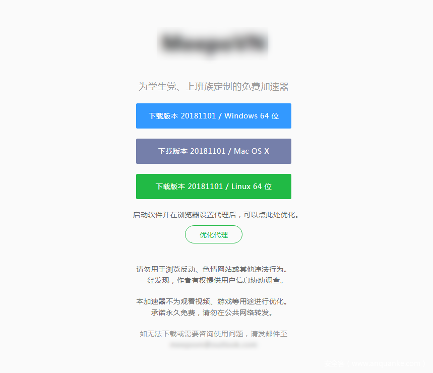 特别注意的是,并不只是Windows系统的用户是挖矿木马的目标,很多挖矿木马是从开源挖矿项目修改而来,可以支持不同的平台。在该VPN软件的官网上(在如下图),提供了针对Windows,MacOS和Linux三种系统的版本,在三个版本的程序中都发现有挖矿相关代码。