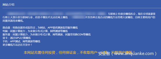 比如上图这款之前曝光过的披着网赚外衣的“三合一”挖矿木马挂机软件,运行起来时疯狂占用CPU资源挖矿,具有修改MBR添加开机密码的功能,还有传播木马的隐患。挂机网赚软件挖矿并不是个例,通常这些网赚挂机软件并不会明确告诉用户“我是挖矿软件”,而是像下图这样打着利用闲置计算能力,做分布式计算的幌子挖矿。