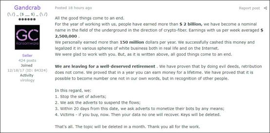 (GandCrab勒索病毒团队官方声明,宣告钱赚够了,准备撤退,留下广大群众原地懵逼)