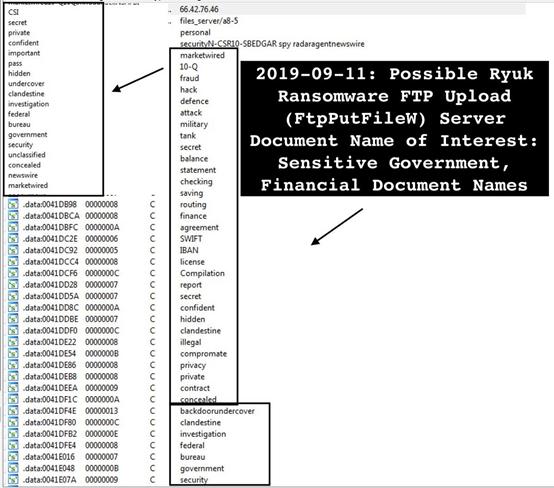 今年有个案例就与窃取情报有关,9月份 MalwareHunterTeam披露了一次不同寻常的勒索病毒事件。它在感染目标中不断搜寻敏感信息,包括军事机密、银行信息、欺诈/刑事调查文件,行动举止完全不像为了图财。更可疑的是,该“勒索病毒”还会查找Emma、Olivia、Noah、Logan 和 James 等美国社会保障部列出的2018年最常见的婴儿名字。