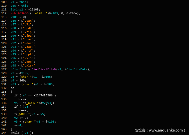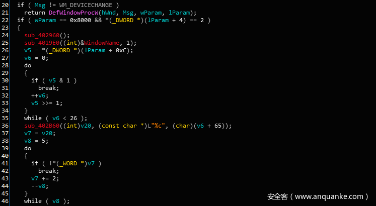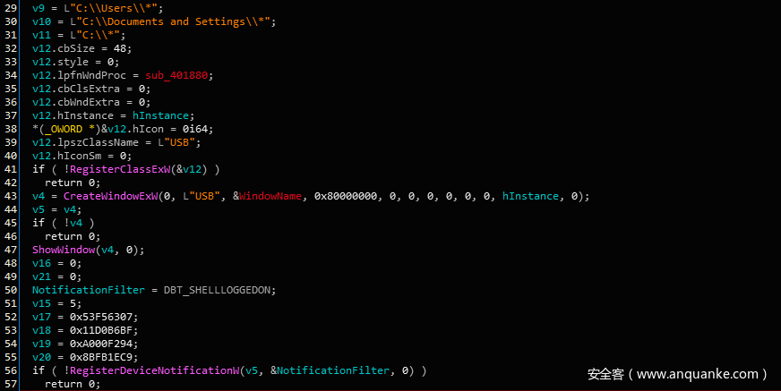 windrv模块主要功能是从USB等移动设备中窃取指定后缀的敏感文件。窃取的文件会被存储在本地磁盘指定目录中。主要功能代码如下:样本会创建一个类名为:“USB”的窗口程序,并设置其能够接收新增设备的消息通知。