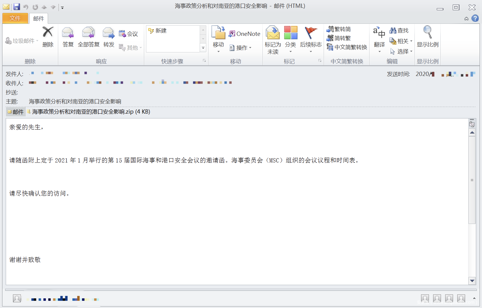 该组织活动较为频繁,近期安恒威胁情报中心捕获到该组织以“海事政策分析和对南亚的港口安全影响”、“2020年自主研发项目立项论证报告”等主题对我国政府部门、科研机构相关人员发起定向攻击。发件人为国内某船舶贸易公司邮箱,那么邮箱账号可能已被该组织掌握。
