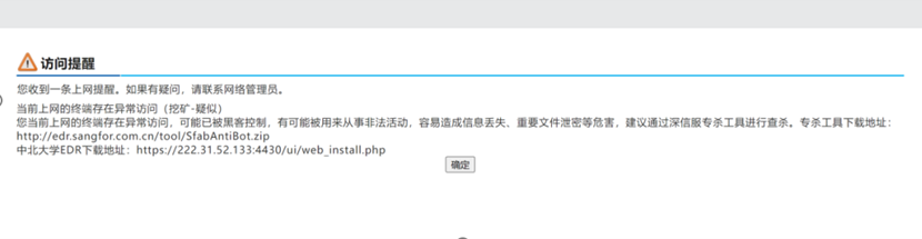 为进一步加强中北大学终端安全管理,规范用户互联网访问行为,降低蠕虫、病毒、挖矿等带来的危害,进一步进行精准防控,学校定于5月16日起对11号主楼、软件学院楼、9号实验楼、科学楼范围内的网络进行网络安全优化调整。用户终端访问互联网时被检测到木马、挖矿、蠕虫病毒等流量特征,在通过浏览器访问外部应用时会自动跳转到【访问提醒】,此时用户终端会被隔离,无法访问互联网,封禁时间2小时。在此期间用户需要根据【访问提醒】进行操作,安装EDR杀毒软件进行全盘杀毒。2小时过后,用户终端即可正常访问互联网。