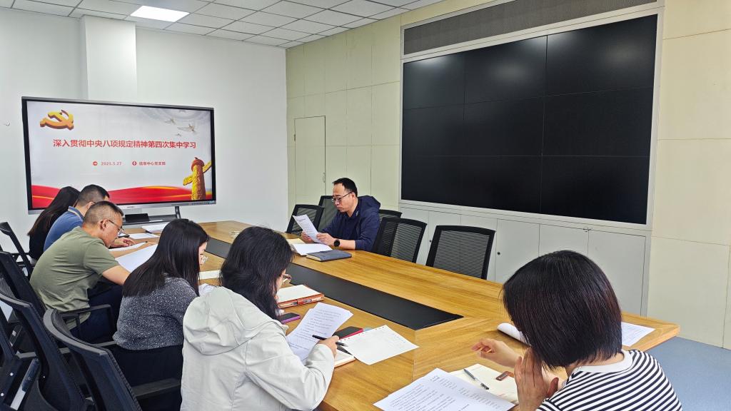 根据教辅党委要求和信息中心党支部深入贯彻中央八项规定精神学习教育计划,5月27日上午,信息中心党支部组织开展了深入贯彻中央八项规定精神第四次集中学习会。会议由党支部书记孙豫峰主持,支部全体成员在岗人员参加。