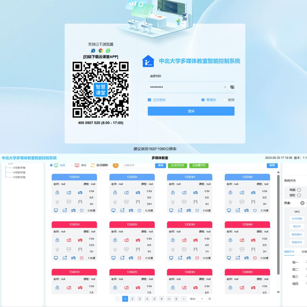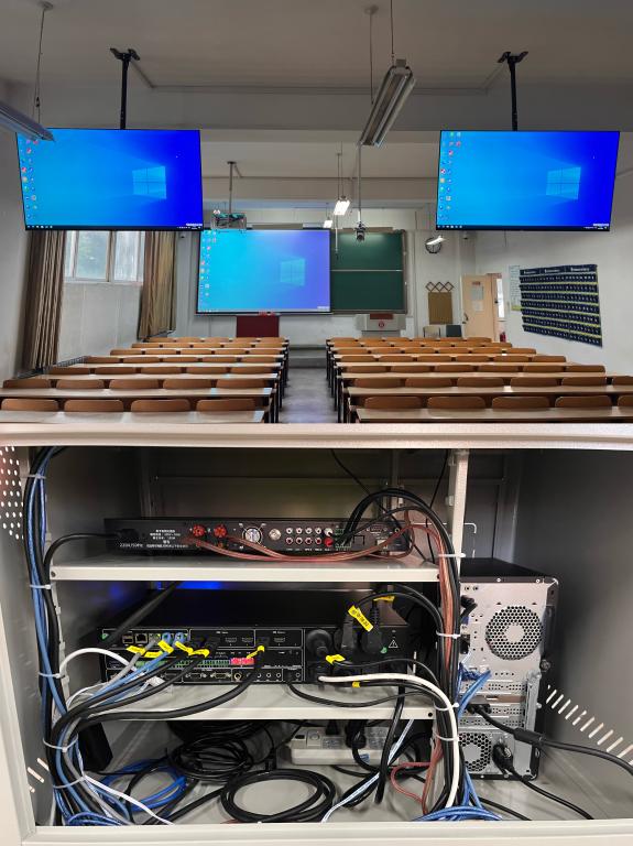 此次改造主要包括高清激光投影机、高性能台式计算机、智慧管理主机、宽屏电动幕布、教学辅助屏、教室智能控制与数据采集系统、开放式多媒体讲台等。不仅为广大师生提供更好的信息化教学环境,上课前10分钟所有多媒体设备会根据课表自动开启,教师直接授课即可,下课后所有设备自动关闭,节省领取多媒体钥匙和开启多媒体设备时间,助力教师轻松教学;而且能够对多媒体设备进行远程实时监测和统一智能控制,可主动发现多媒体设备故障,进一步提升多媒体教室运维服务效率和服务质量。