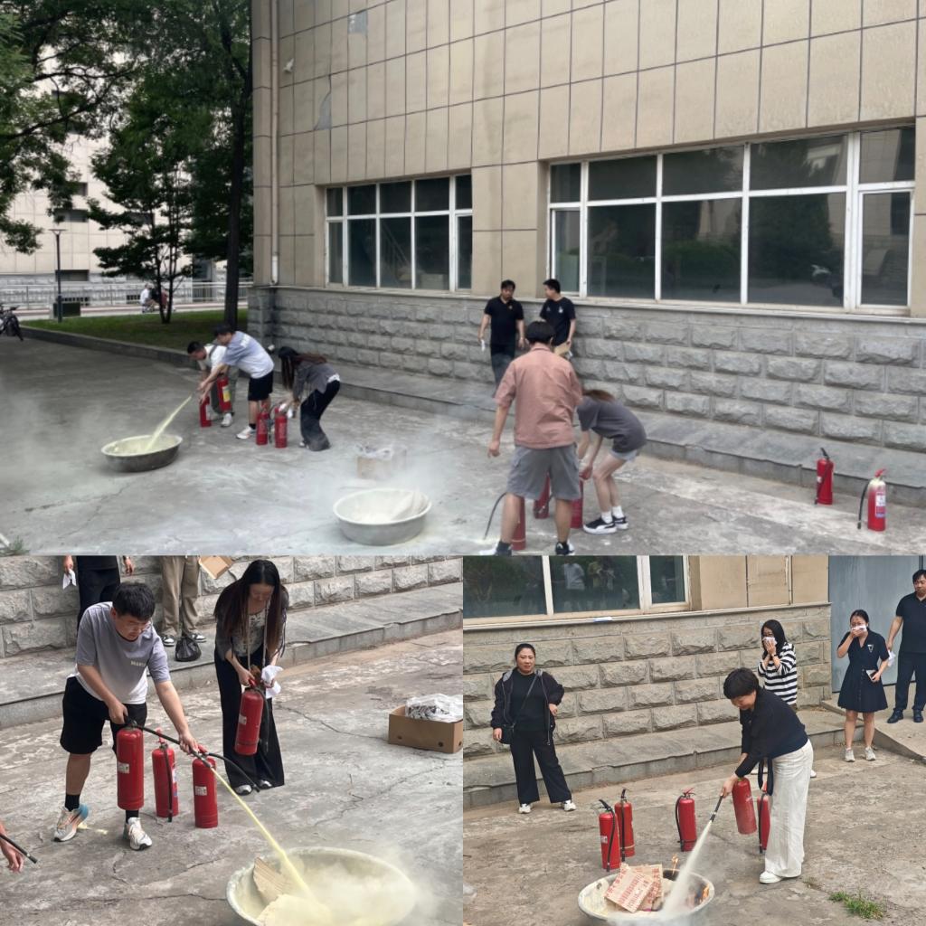 在9号楼西侧空地设置的演练区,参训人员分组开展灭火实操。大家严格遵循“提、拔、握、瞄、压”五步操作法,对准模拟火源进行实战灭火。演练全程组织严密、响应迅速,各环节衔接流畅,充分展现了“快速反应、准确处置、稳妥有序”的应急处置能力,有效检验了培训成果。