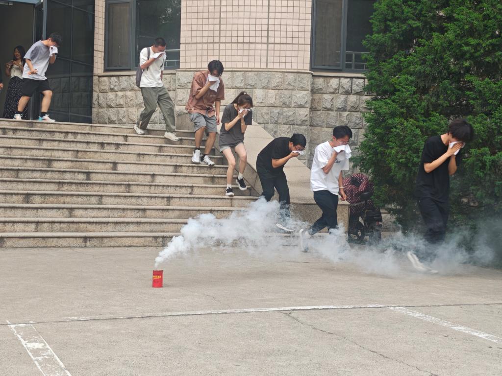 紧接着,信息中心开展消防实操演练。本次演练模拟研讨录播教室因电线短路引发火情的紧急场景,随着警报响起,全体参演人员立即启动应急响应:使用湿毛巾捂住口鼻,采取低姿弯腰规范动作,沿安全疏散通道快速有序撤离至安全区域。