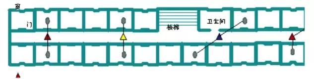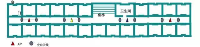 这种模式下AP和天线都部署在楼道,需要注意全向天线的安装位置,尽量使无线信号穿一道隔墙就能够进行用户区域的覆盖。但是若一个楼层宿舍较多,需要4个以上 AP 覆盖时,则同信道的 AP 间必然产生同频干扰。因此在一个楼层 AP 少于 4 个时可以考虑本方式覆盖。